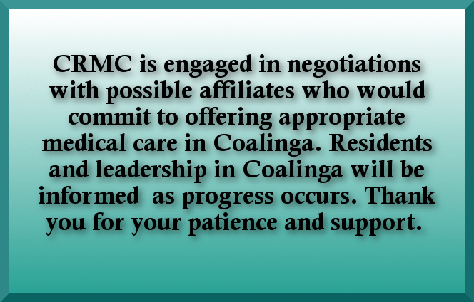 CEO Wayne C. Allen and CRMC staff will be notifying community members such as the City Council of Coalinga and Huron, closest hospitals (Adventist Health Hanford, Kaweah Delta Visalia, and Fresno Community Regional Center), Coalinga Police Department, EMS, and California Highway Patrol.