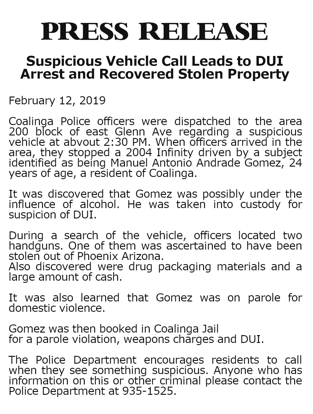Suspicious Vehicle Yields DUI, Stolen Guns & More