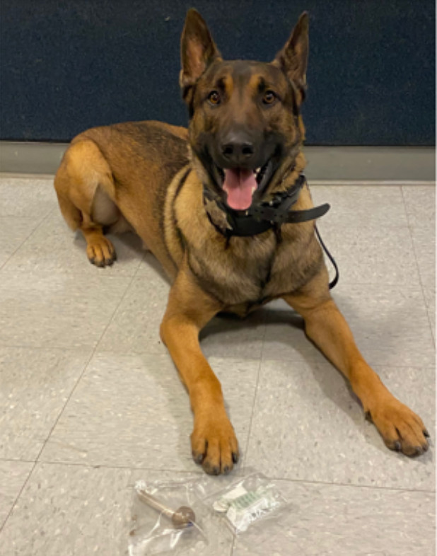 While conducting a search of the vehicle incident to arrest, K9 Eli alerted in an area under the driver’s seat. A sun glass case was located under the seat and inside of that case was a methamphetamine pipe. This brings K( Officer Eli’s finds to well over a dozen finds in vehicle searches.