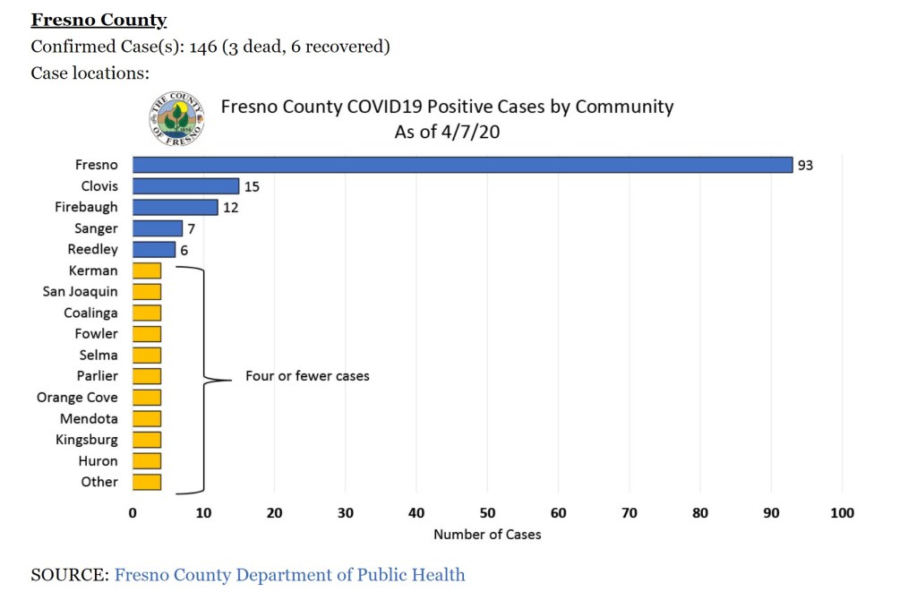 Last week we presented a graph (below) provided by Fresno County Department of Public Health. We also discussed the ramifications of what the graph showed. Not wanting to cause panic, I reported the line provided by FCDPH: Four or fewer cases means that it could be anything from four to zero cases. That was literally as far as I could go with FCDPH.