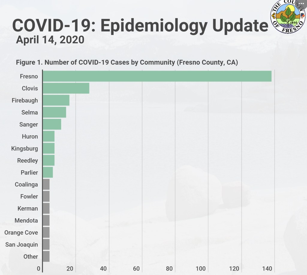 Today’s graph (Tuesday, April 14) the community of Coalinga is at the top of the list of those towns with four or fewer cases. I am not an expert, but I am going to surmise that the towns are ranked along that list according to how many cases they have. I am guessing that by Friday, Coalinga will be listed with the other communities which have five or more cases of Covid-19.