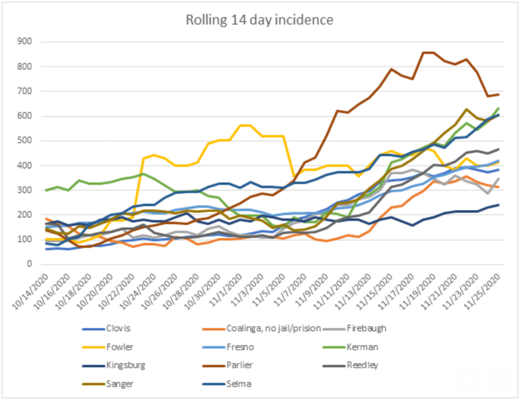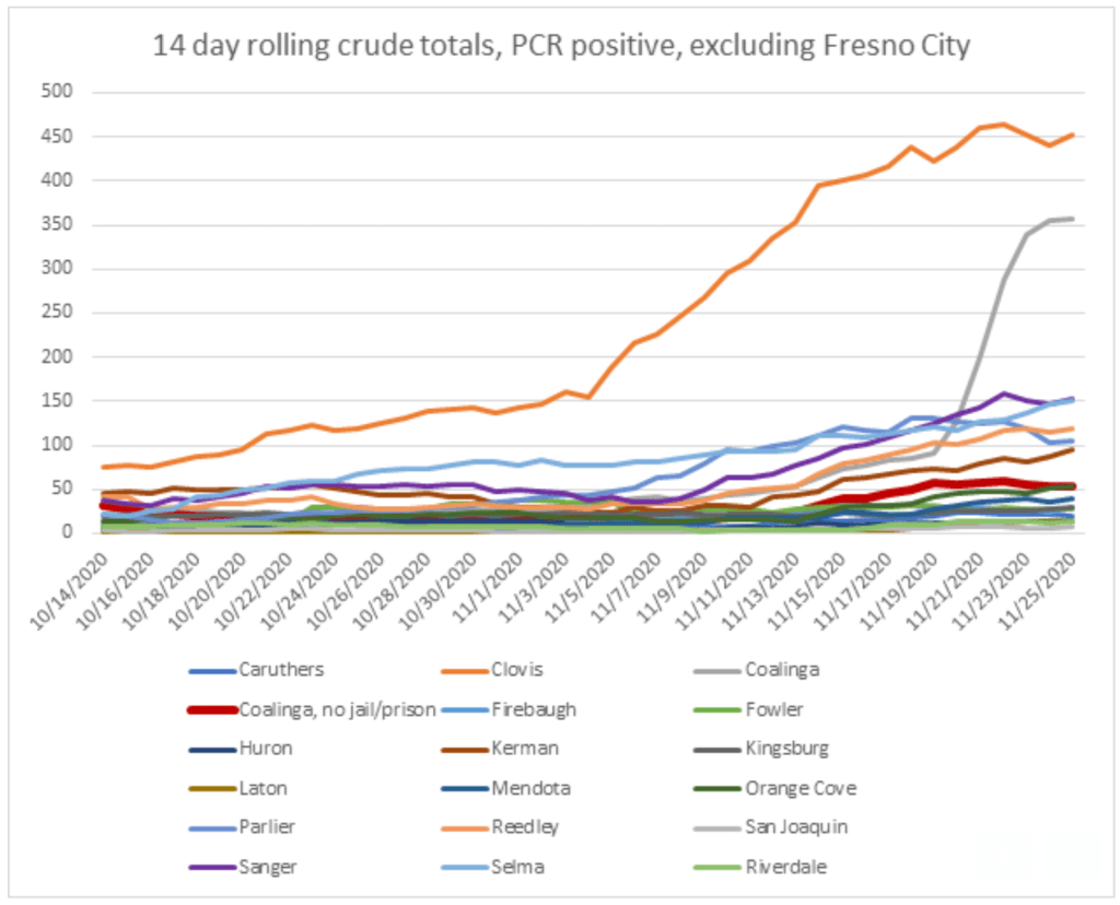 The three graphs below show the growth of case data for the specified dates on each. The first graph shows Coalinga clustered on the graph so closely to other communities that the yellow line is buried. That is the indicator which does not include prison or state hospital. The gray line shows the gross Coalinga total (including PVSP and CSH).