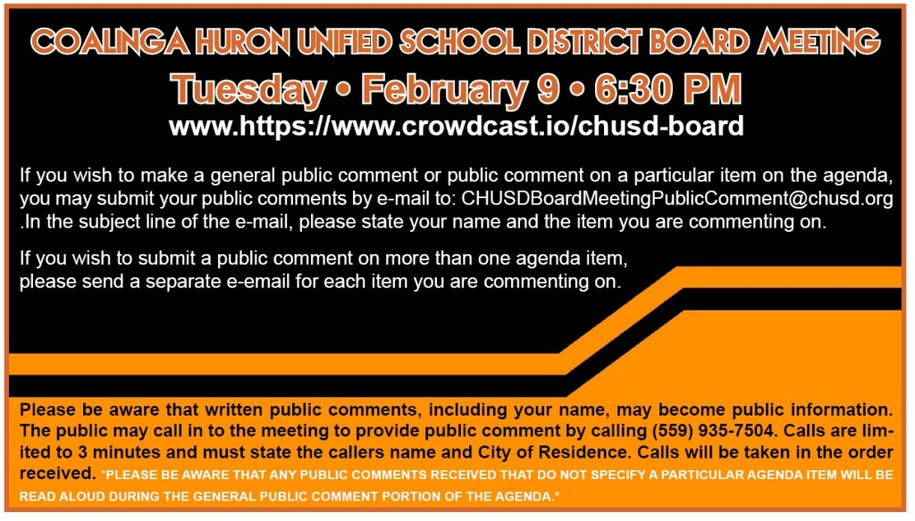 Email comments you would like to be heard at the board meeting to CHUSDBoardMeetingPublicComment@chusd.org. You should include the topic and your name along with where you live.