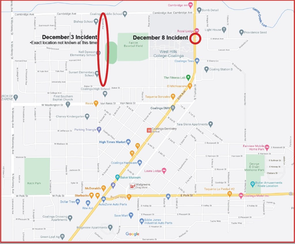On Tuesday, December 8, 2021, Coalinga police officers responded to a report of a pedestrian struck by a vehicle at the intersection of Elm Avenue and Walnut Street At approximately 3:30 PM.