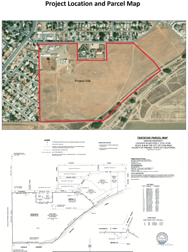 To consider a recommendation to the City Council regarding the approval of a Tentative Parcel Map Application for Assessor’s Parcel Number (APN) 083-090-51, to subdivide the existing approximate 50.48 net acre property into one (1) residential zoned parcel and one (1) remainder parcel. The purpose of this request to subdivide the parcel, is to allow for the property owner to sell the residential single family zoned parcel of land to a prospective residential developer, consistent with the Subdivision Map Act. The project is currently designated for Residential Single Family land use by the Coalinga General Plan and zoned as RSF (Residential Single Family).