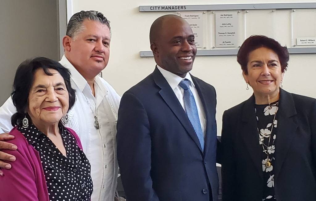 Latina Rights icon, Delores Huerta, stands with Huron’s mayor, Rey Leon, State Superintendent of Schools, Tony Thurmond, and Senator Ana Caballero as they make a joyous announcement about Huron’s future high school.