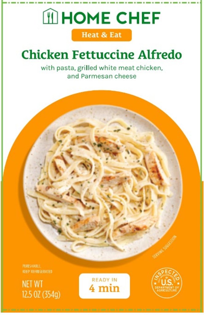 - 12.5 oz. tray packages containing “HOME CHEF Heat & Eat Chicken Fettuccine Alfredo with pasta, grilled white meat chicken, and Parmesan cheese” with best-by date 06/19/25 or prior.