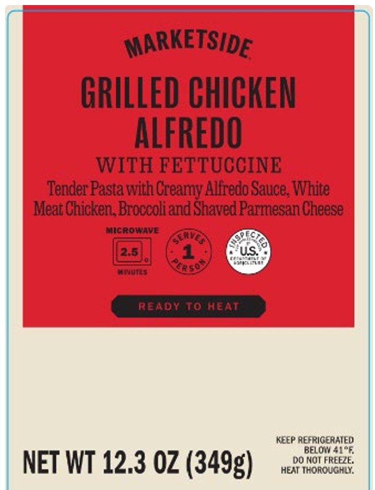 - 32.8-oz. tray packages containing “MARKETSIDE GRILLED CHICKEN ALFREDO WITH FETTUCCINE Tender Pasta with Creamy Alfredo Sauce, White Meat Chicken and Shaved Parmesan Cheese” with best-by date 06/27/25 or prior.